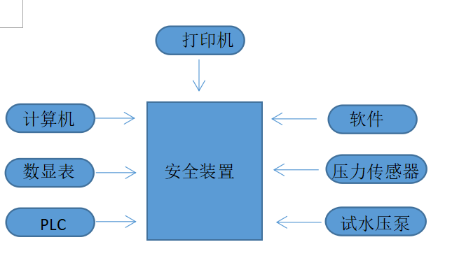 水壓裝置主要由計(jì)算機(jī)、數(shù)顯表、PLC、軟件、壓力傳感器、試水壓泵等組成。水壓裝置組成示意圖如圖。